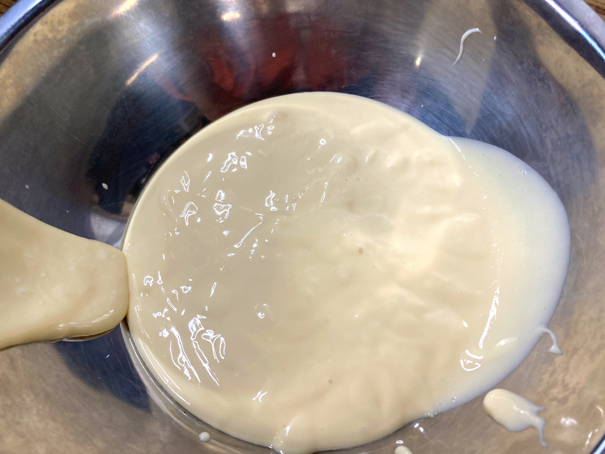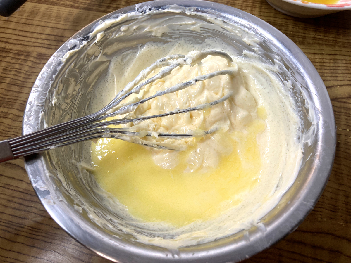 次は牛乳+溶かしバターを加えます。生クリームがあれば、生クリームを使ったほうがいいと思います。今回は少量だけなので、代用していますけど。