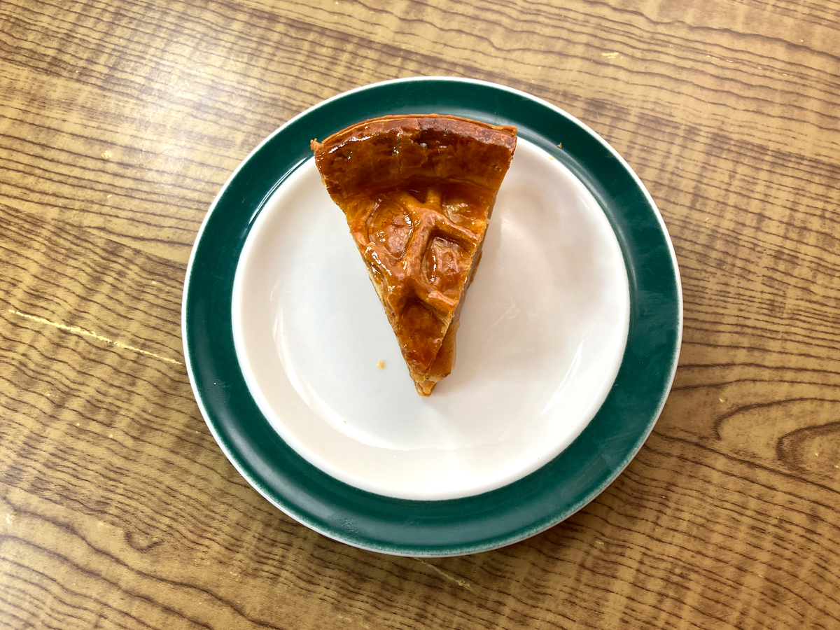 見た目は昔ながらのアップルパイという感じで、上がテラテラしていて食欲をそそります。