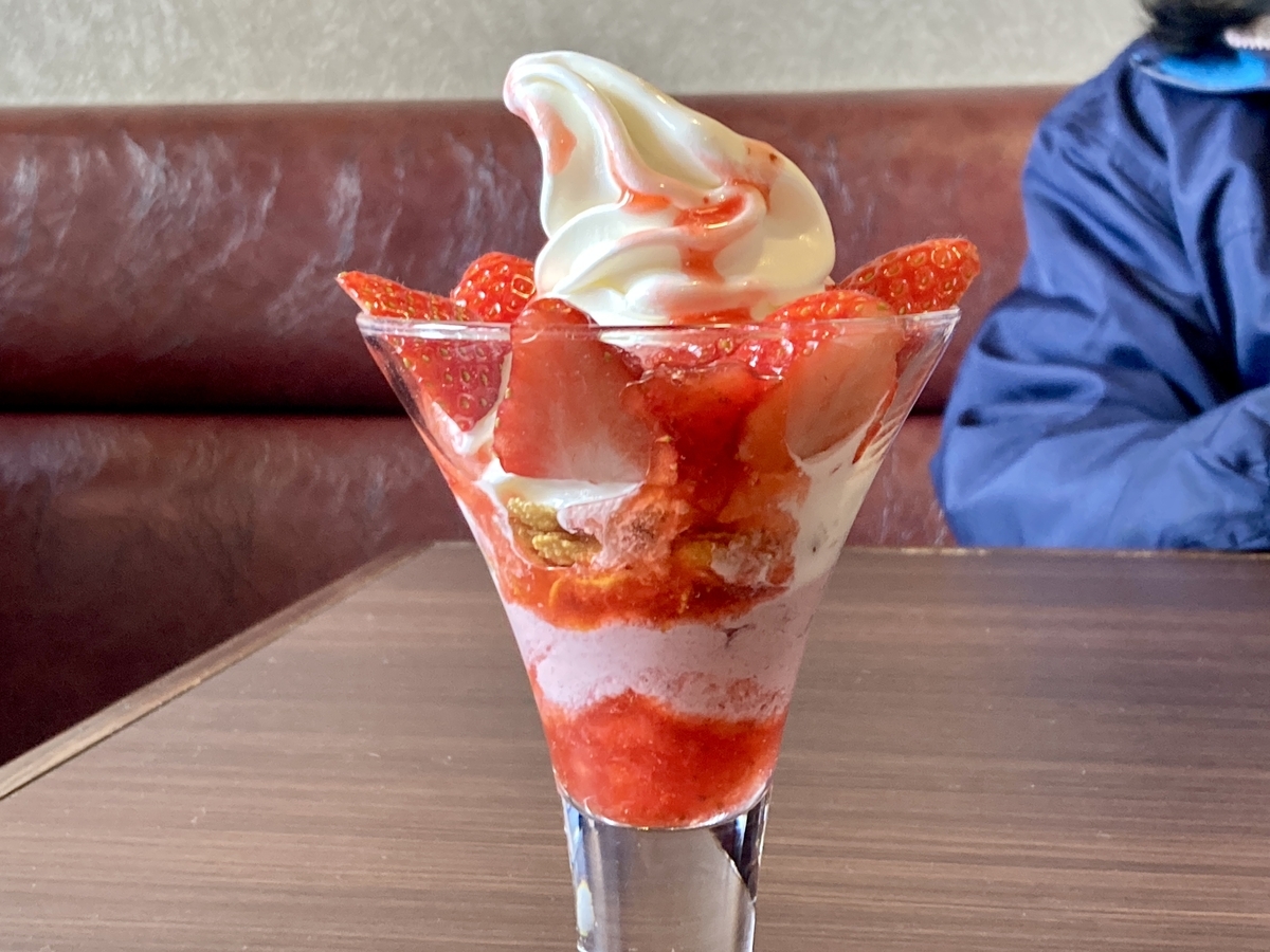 一番上にはソフトクリームといちごソース。カットいちごは3粒使われています。