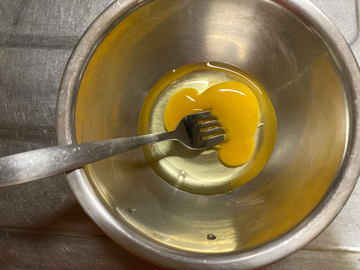 ボウルに卵を入れて、フォークでしっかりと溶きほぐします。