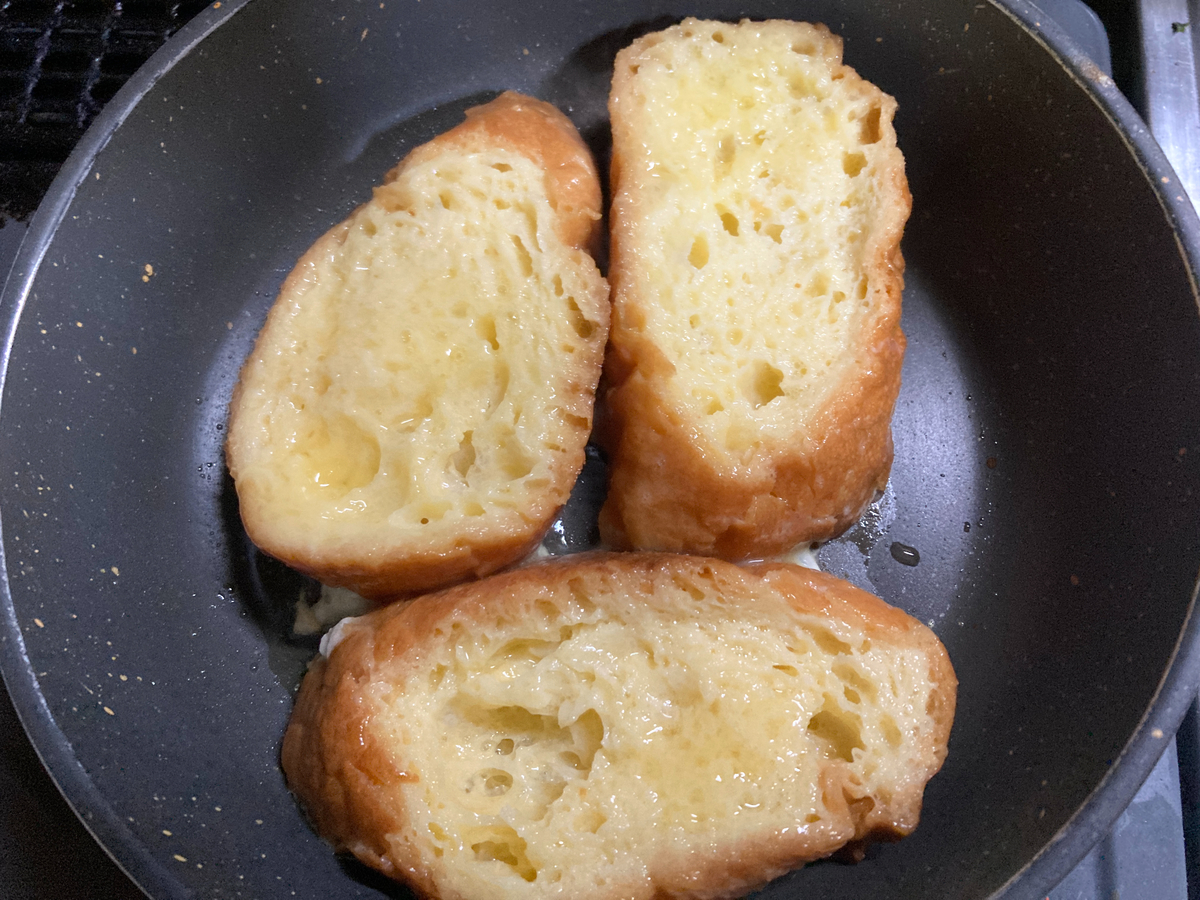 レシピではポリ袋に入れ、バゲットを浸して口を閉じ、しっかりと卵液をバゲットに馴染ませます。染み込ませる時間はバゲットの硬さによって異なるそうです。