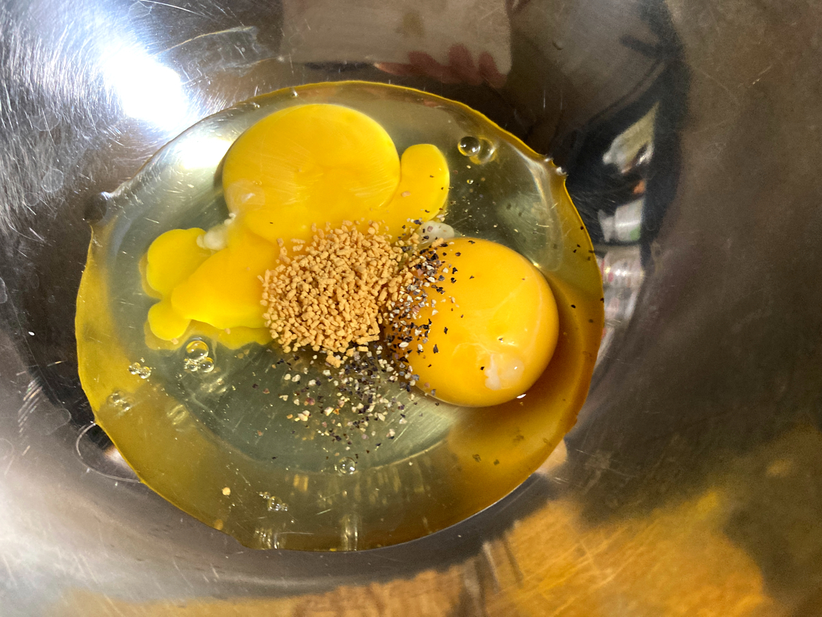 この時、泡立て器を使って、黄身と白身が徹底的に混ざるまでやると個人的により美味しく仕上がると思います。