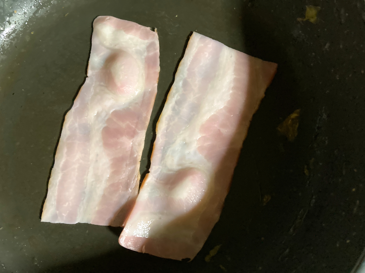 ここで、ようやく「あ、ベーコン焼いてねー!」ということに気づき、一旦、パンを外に出してからベーコンを焼き始めました。