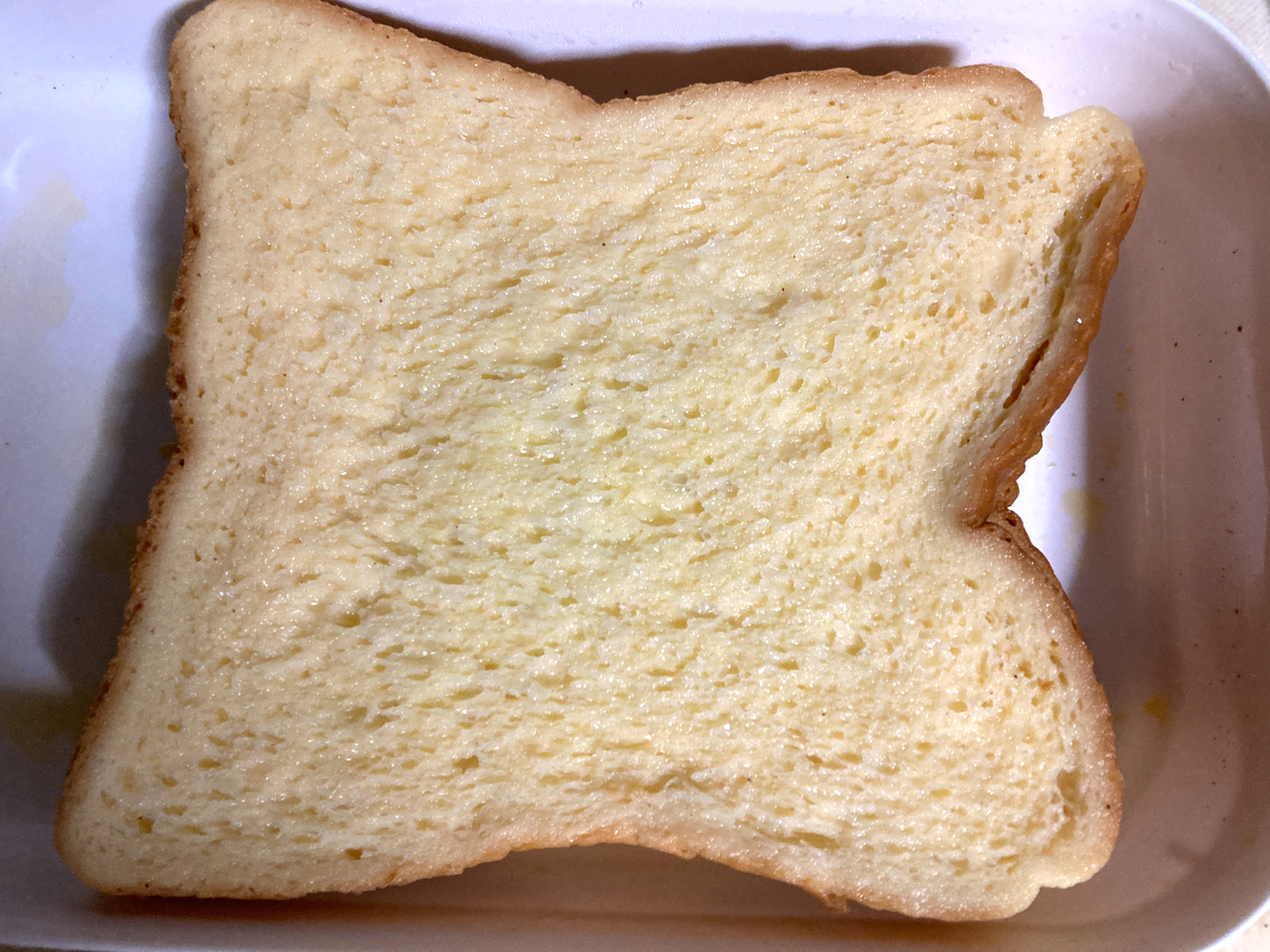 ところで、パンがふわふわしっとりしてるんですよね。冷凍庫に数日入れておいたので、乾燥が進んだと思っていたのに、まだ中に水分が多そうなので、ちゃんと染みないかも……。