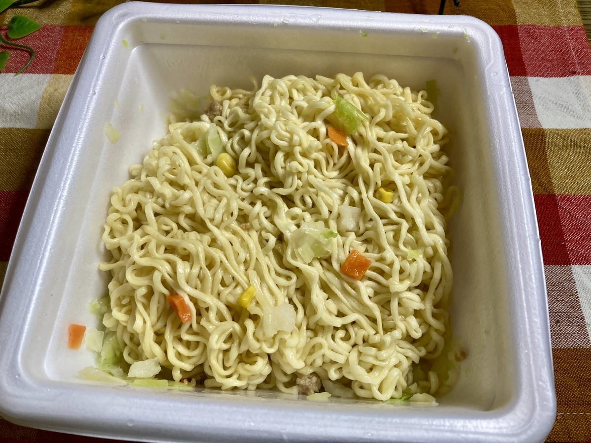 早速作りました。具はコーンや人参、謎肉とシチューっぽさがありますし、キャベツも入っていて焼きそばっぽさもあります。