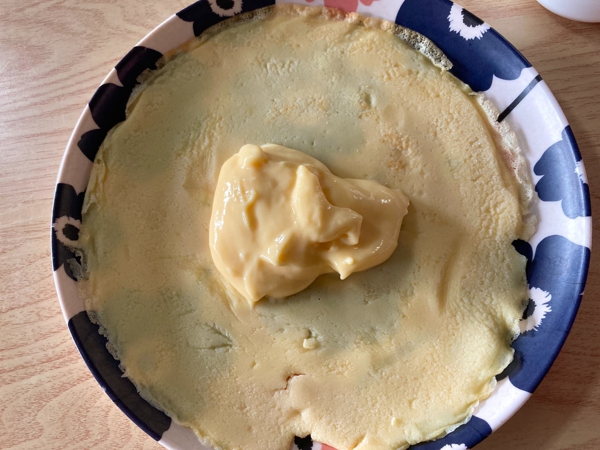 クレープの真ん中にツヤツヤのカスタードを置きます。