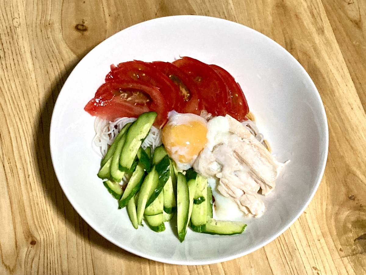 2.きゅうり、トマトを切る。ゆで鶏を食べやすくちぎり、ビーフンの上に乗せる。