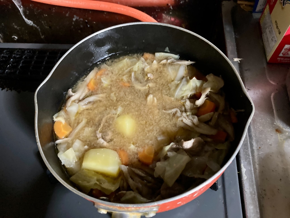 3.水を入れ、ひと煮立ち。弱火にしてフタをして10分。火を止めて味噌を溶き入れる