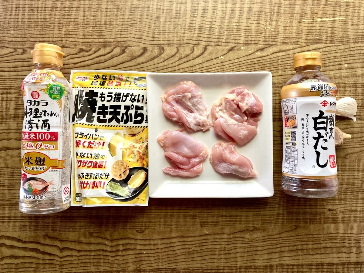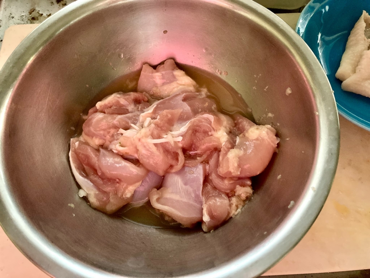 1.鶏もも肉は皮を取り、一口サイズに切り、薄く開く。おろしショウガ・にんにく、白だし、清酒を揉み込んで30分置く