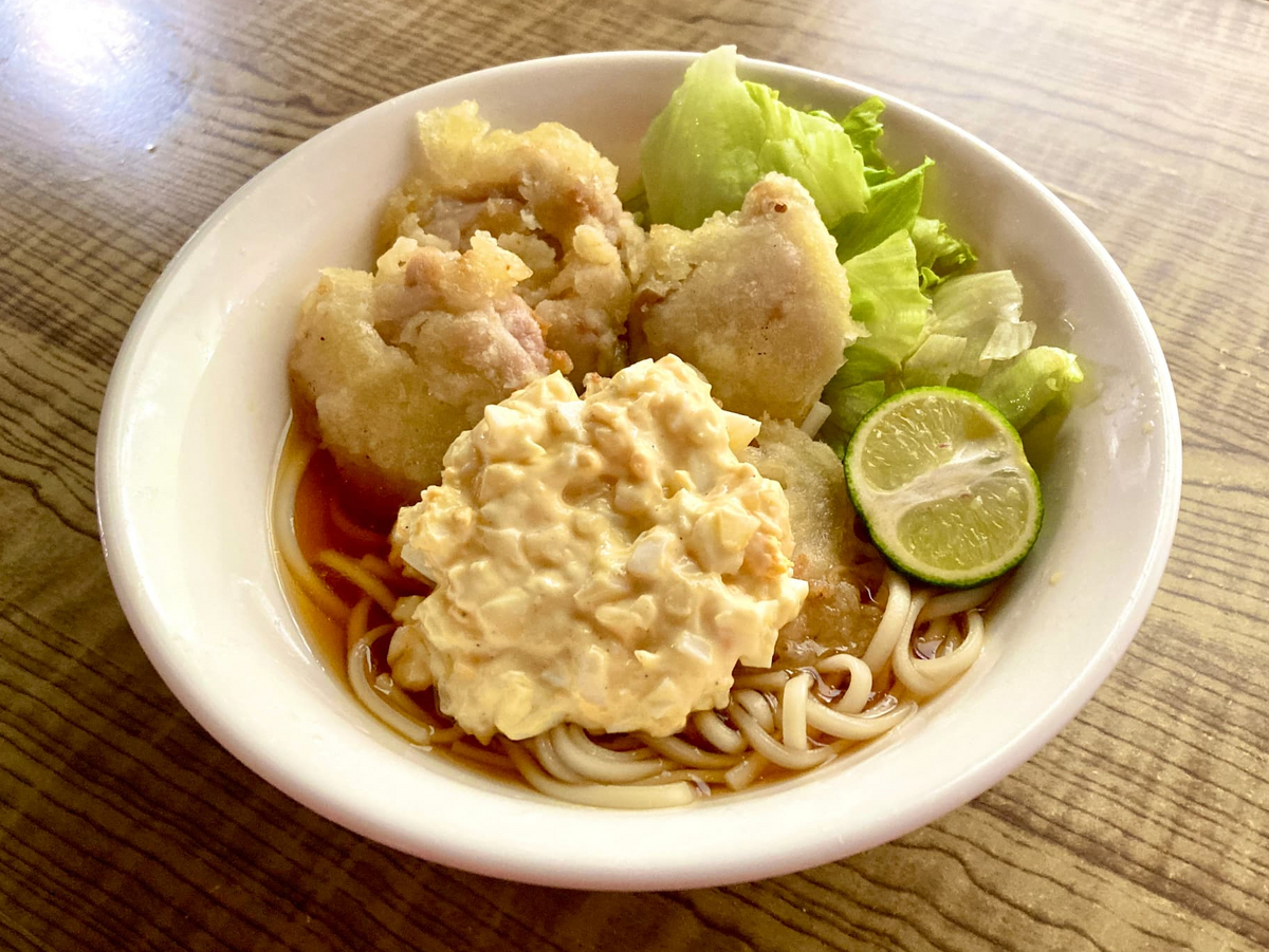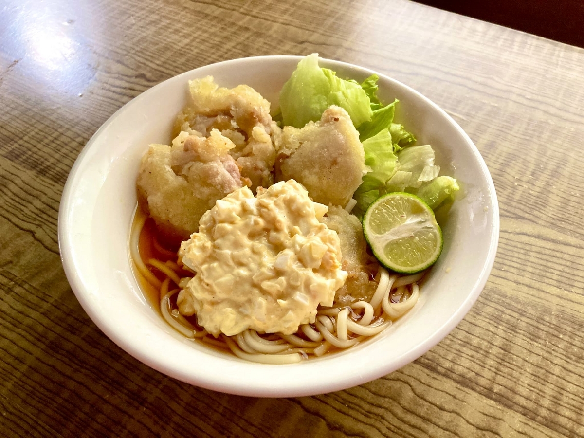 つゆを入れた皿に、うどん、レタス、かぼす、鶏天4つ、タルタルソースを盛り付けたら完成です。