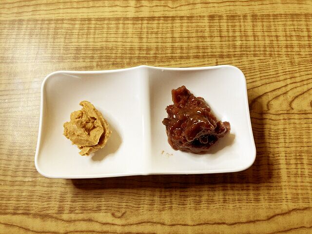 1.あんことピーナツバターをそれぞれ別々の耐熱容器に入れ、電子レンジで30秒温める
