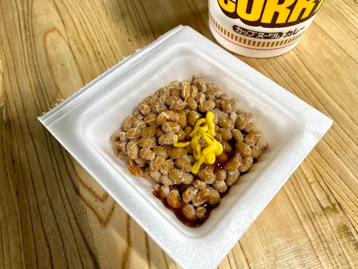 カップヌードルカレーと納豆と一味唐辛子を用意。