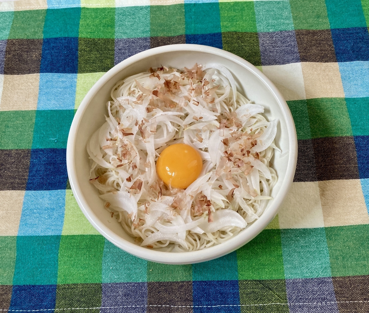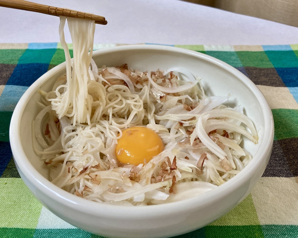 そして、お皿にそうめん、新玉ねぎ、かつお節、卵黄を乗せ、めんつゆと胡麻油をかけたら完成です。