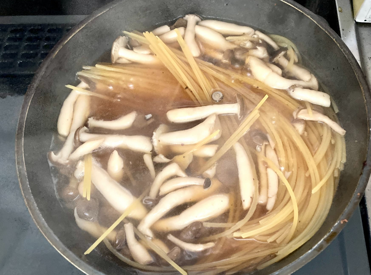パスタを入れて、茹でます。本当はシメジもこのタイミングで入れてもいいですが、今回のパスタは早茹でタイプなので最初に入れました。