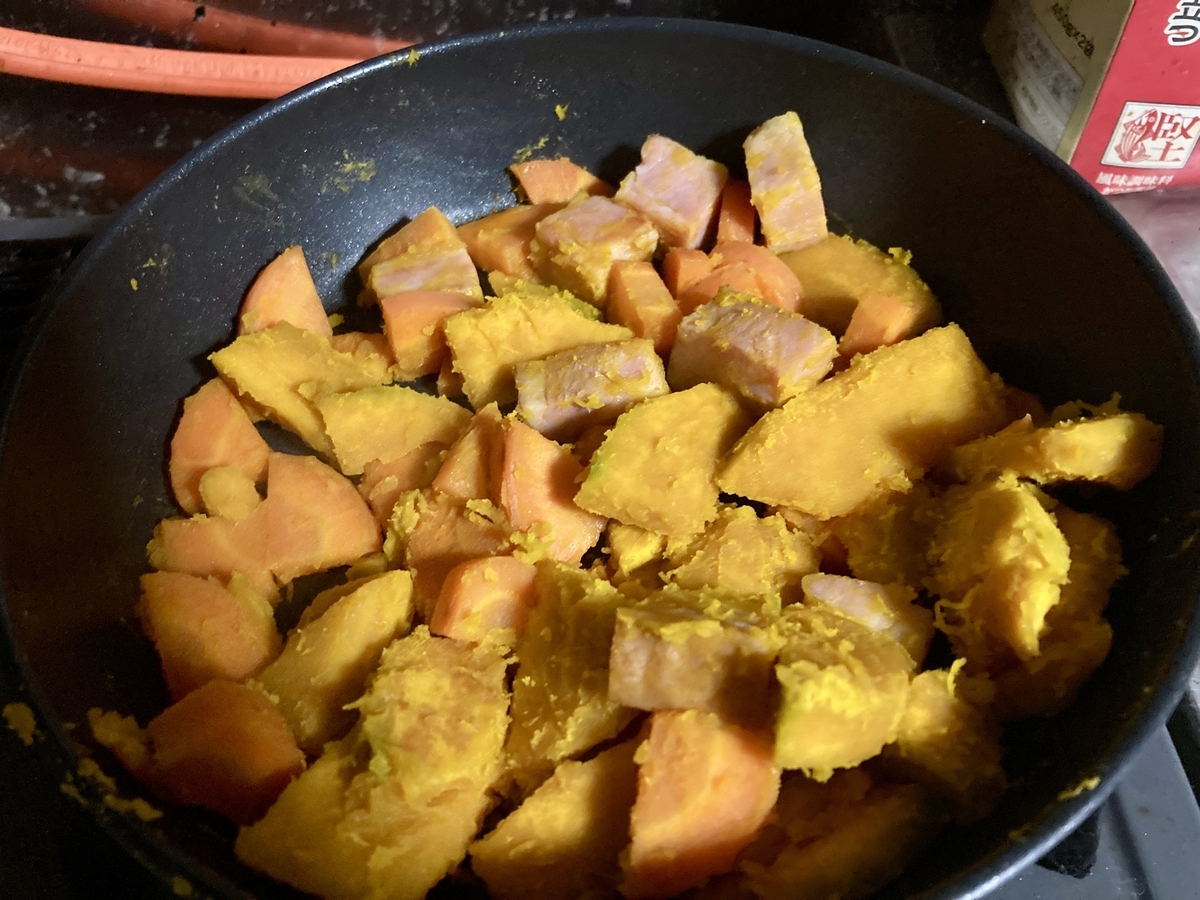 じっくり炒めたり、途中、少量の水を入れてフタをして蒸し焼きにしたりして、かぼちゃと人参に火を通しました。