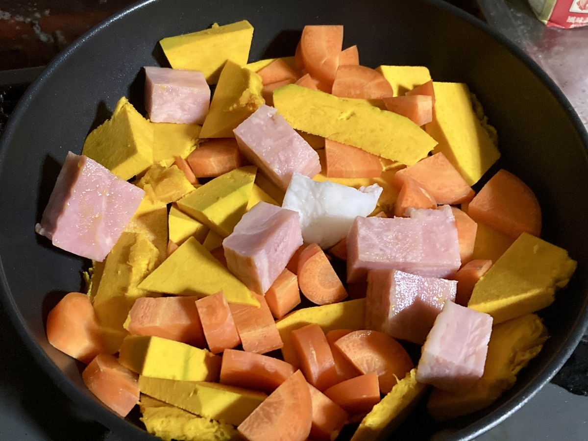 2.フライパンで家の中にある油を温め、人参とかぼちゃとベーコンを弱火と中火の間くらいの火加減でじっくりと炒める。フライパンがヤバそうと思ったら、水を少量入れて蒸し焼きにしてみる。