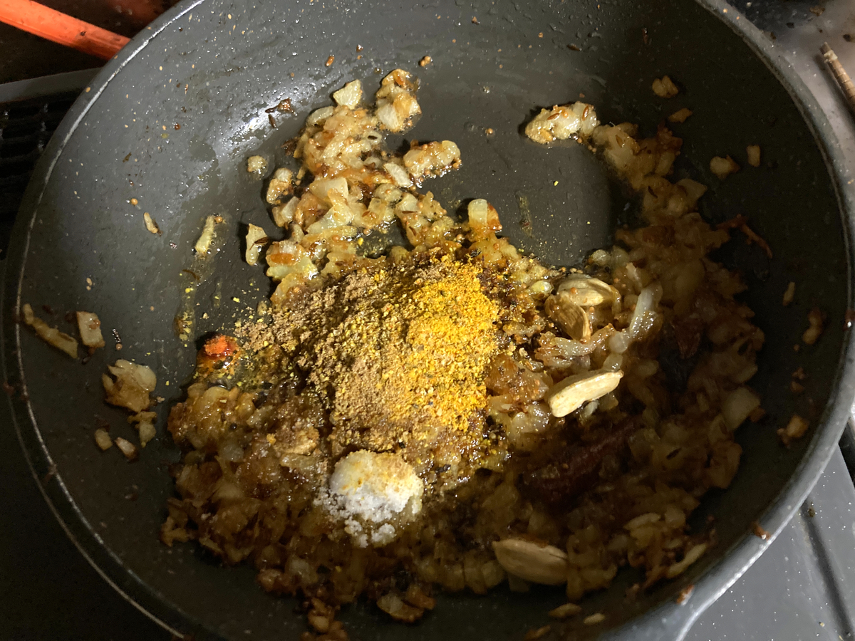 パウダースパイスと塩を入れます。スパイスが焦げないように少量だけお水を入れます。
