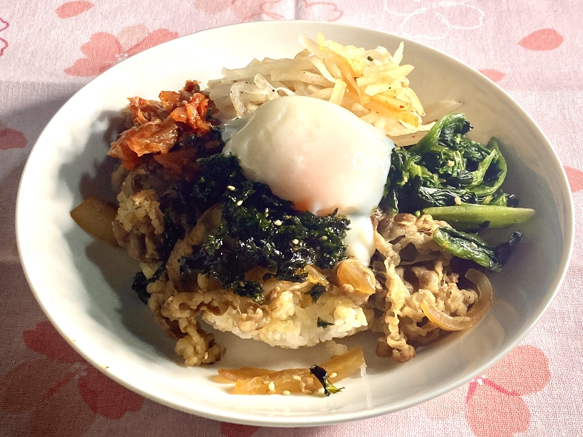 レトルトの牛丼に近所のスーパーの惣菜コーナーで売っているナムルセット乗せれば完成じゃんと思いました。